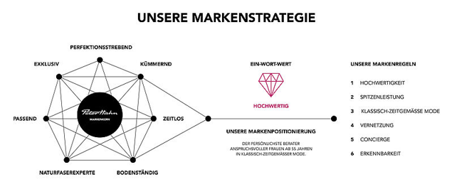 Peter Hahn verfolgt eine klare Markenstrategie. Diese besagt das die Marke Kümmernd, Zeitlos, Bodenständig, Naturfaserexperte, Passend, Exklusiv und vor allem Perfektion strebend sein soll. Daraus ergibt sich dann Ein-Wort-Wert