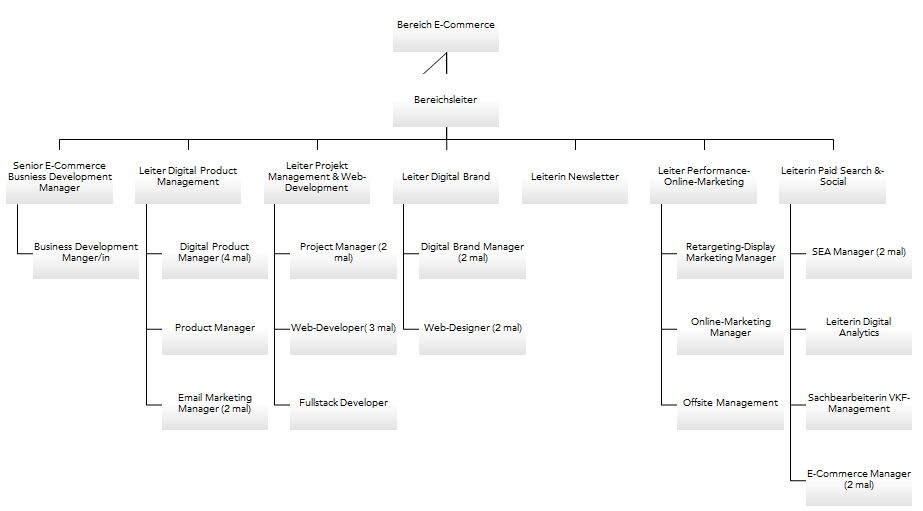 Mein Arbeitsbereich, E-Commerce, gibt es noch nicht allzu lange, daher besteht das Team aus recht vielen jungen Leuten und auch einigen Praktikanten, insgesamt arbeiten hier ca. 40 Mitarbeiter. Diese Abteilung unterteilt sich in kleiner Arbeitsgruppe. Zum einen der Bereich in welchem ich eingesetzt werde, Digital Brand Marketing, welcher aus 5 Leuten und mir besteht. Im folgenden Schaubild sieht man alle Bereiche in einem Organigramm grob zusammengestellt.